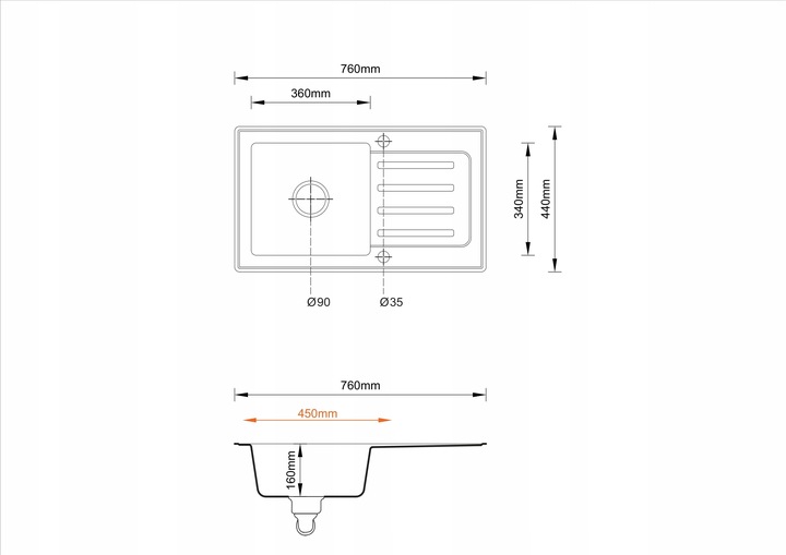 - Otwory w zlewozmywaku: 2 otwory w standardzie (góra i dół)