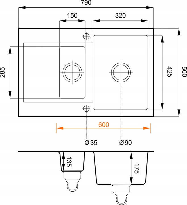 - Otwory w zlewozmywaku: 2 otwory w standardzie (góra i dół) Jeśli życzą sobie Państwo mniej lub więcej otworów, bardzo proszę o taką informację w wiadomości do sprzedającego, używając literek na zdjęciu poniżej oraz o informację, po której stronie ma się znajdować ociekacz