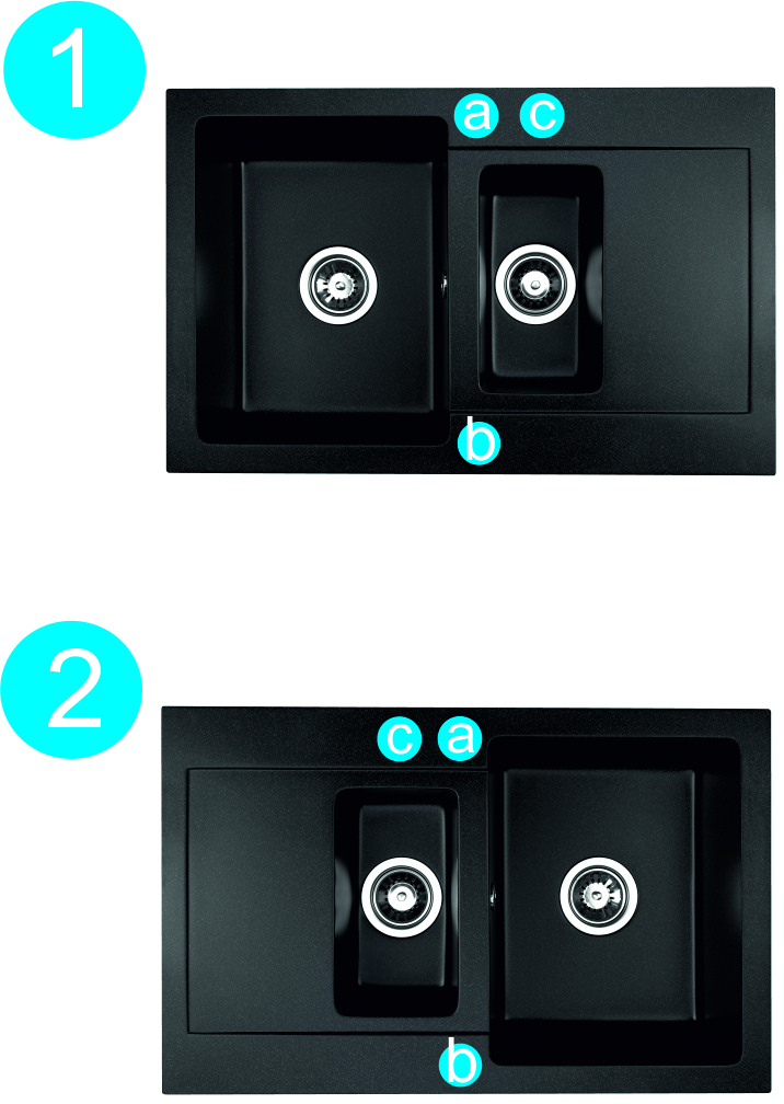 - Otwory w zlewozmywaku: 2 otwory w standardzie (góra i dół) Jeśli życzą sobie Państwo mniej lub więcej otworów, bardzo proszę o taką informację w wiadomości do sprzedającego, używając literek na zdjęciu poniżej oraz o informację, po której stronie ma się znajdować ociekacz