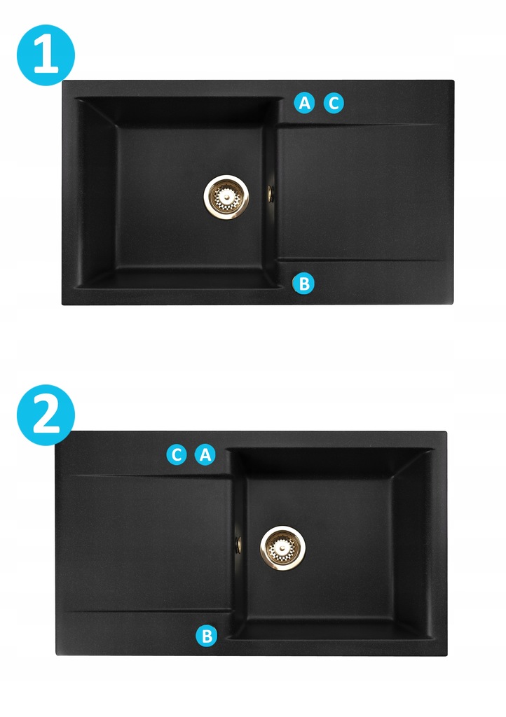 - Otwory w zlewozmywaku: 2 otwory w standardzie (góra i dół) Jeśli życzą sobie Państwo mniej lub więcej otworów, bardzo proszę o taką informację w wiadomości do sprzedającego, używając literek na zdjęciu poniżej oraz o informację, po której stronie ma się znajdować ociekacz.