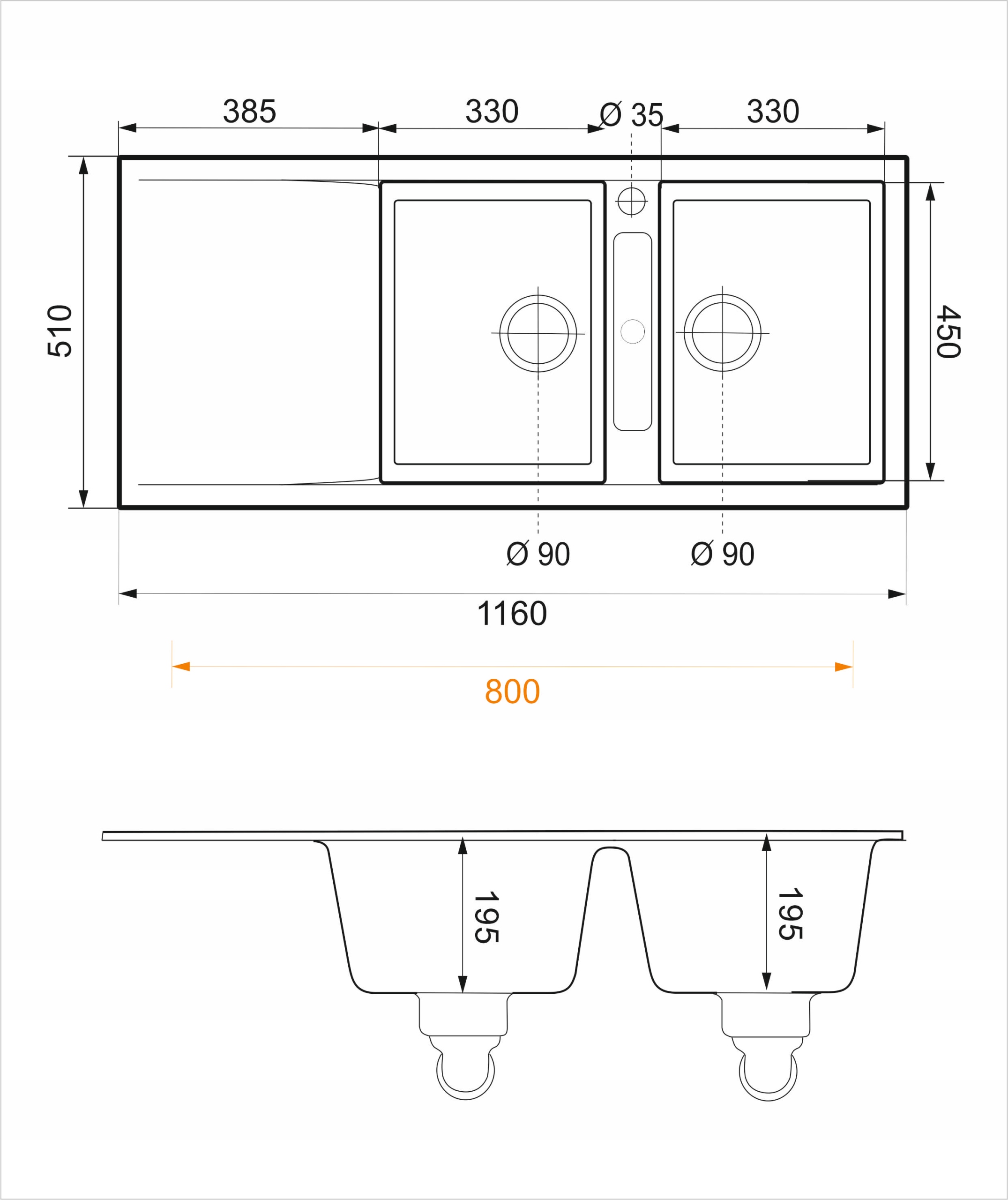 - Otwory w zlewozmywaku: 2 otwory w standardzie (góra i dół)