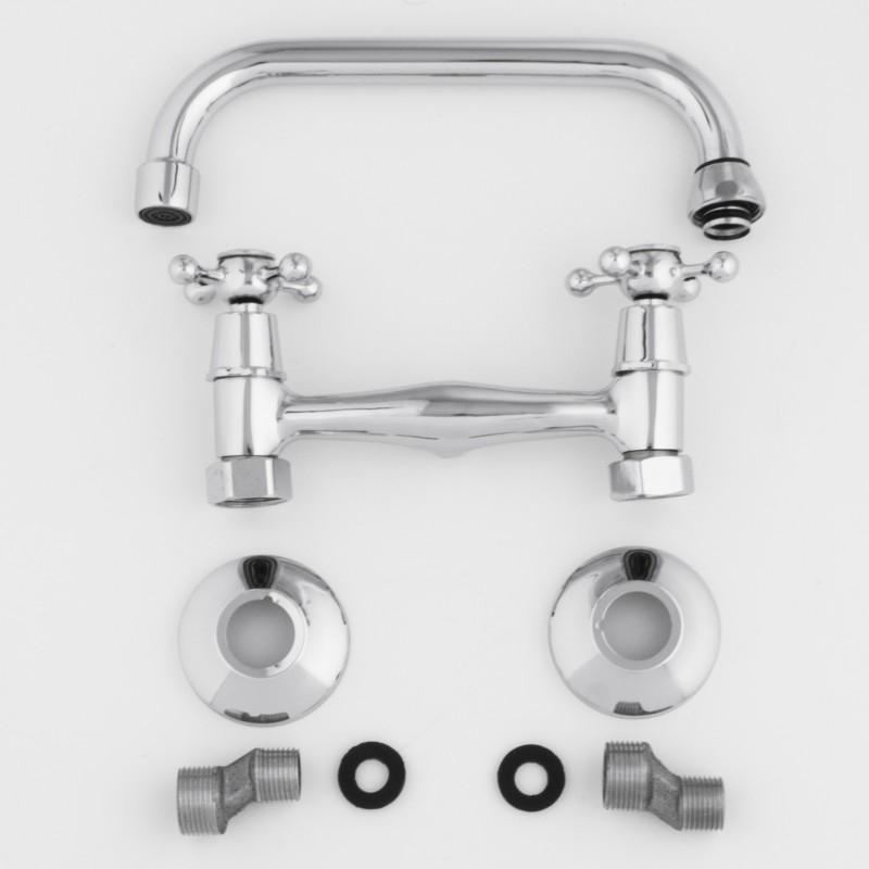 Mechaniczna bateria zlewozmywakowa, ścienna, dwuuchwytowa. Jest to bardzo praktyczne rozwiązanie do każdej kuchni. Głowica mosiężna. Posiada wyprofilowaną, obrotową wylewkę. Napowietrzająca końcówka - perlator - ogranicza zużycie wody nawet o 40%. W zestawie znajdują się wszystkie elementy potrzebne do montażu.