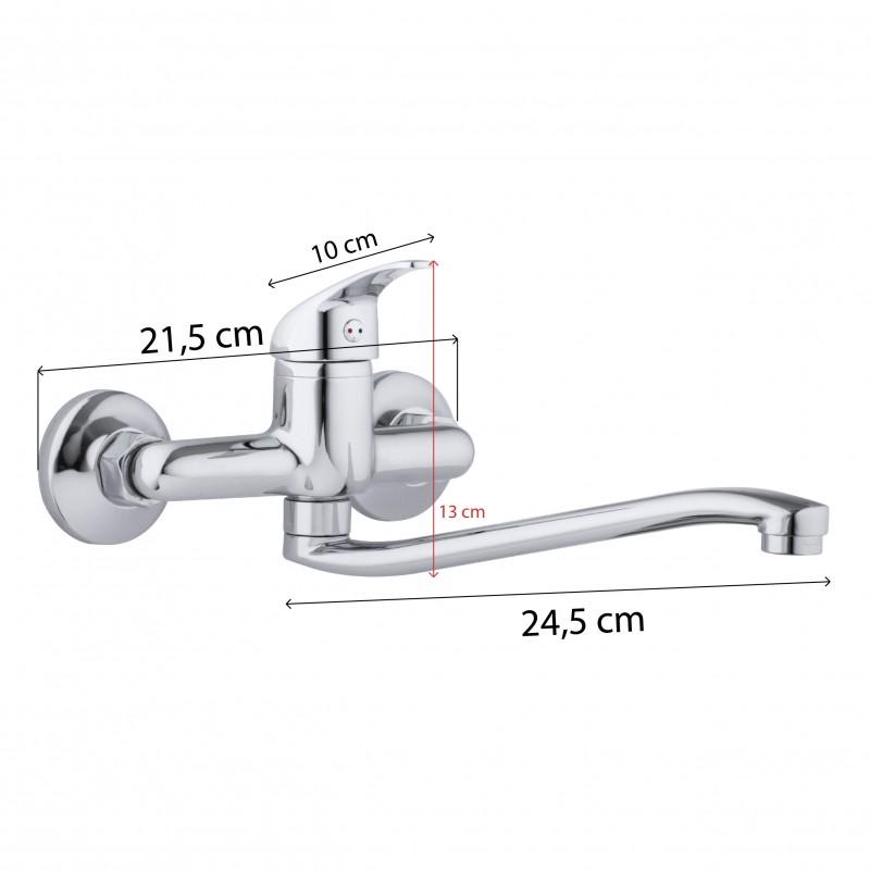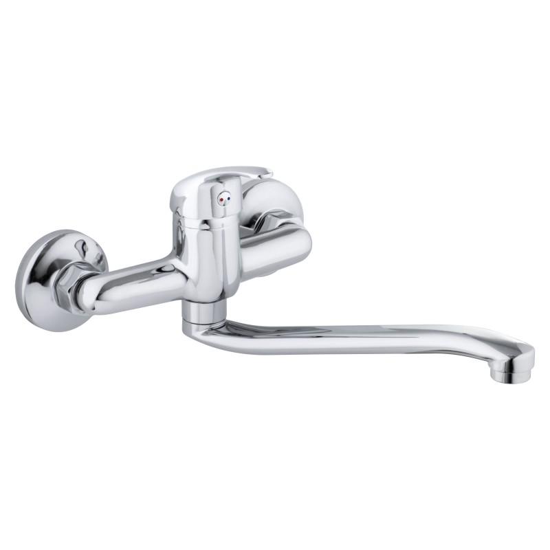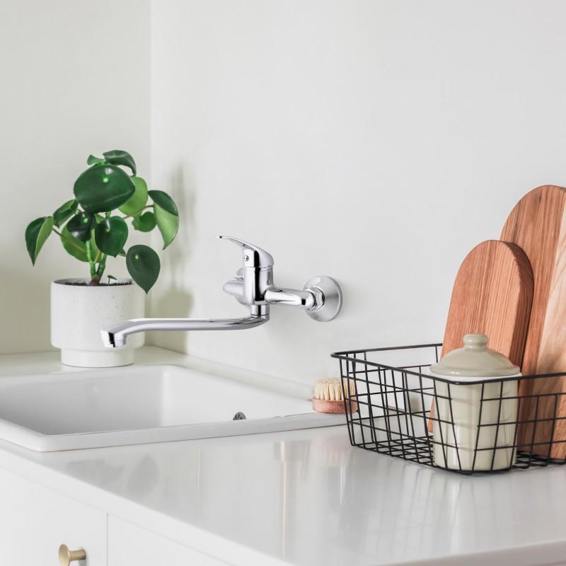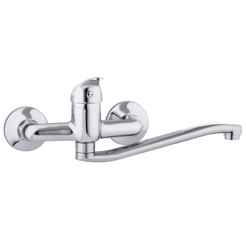 Mechaniczna bateria zlewozmywakowa, ścienna, jednouchwytowa. Głowica ceramiczna. Posiada długą, obrotową wylewkę.