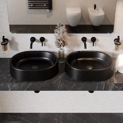Stylowa umywalka nablatowa wykonana z trwałego konglomeratu granitowego. Odporna na zarysowania, wysokie temperatury i środki chemiczne. Idealna do nowoczesnych i klasycznych łazienek. Polski produkt wysokiej jakości.