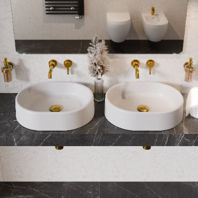 Stylowa umywalka nablatowa wykonana z trwałego konglomeratu granitowego. Odporna na zarysowania, wysokie temperatury i środki chemiczne. Idealna do nowoczesnych i klasycznych łazienek. Polski produkt wysokiej jakości.