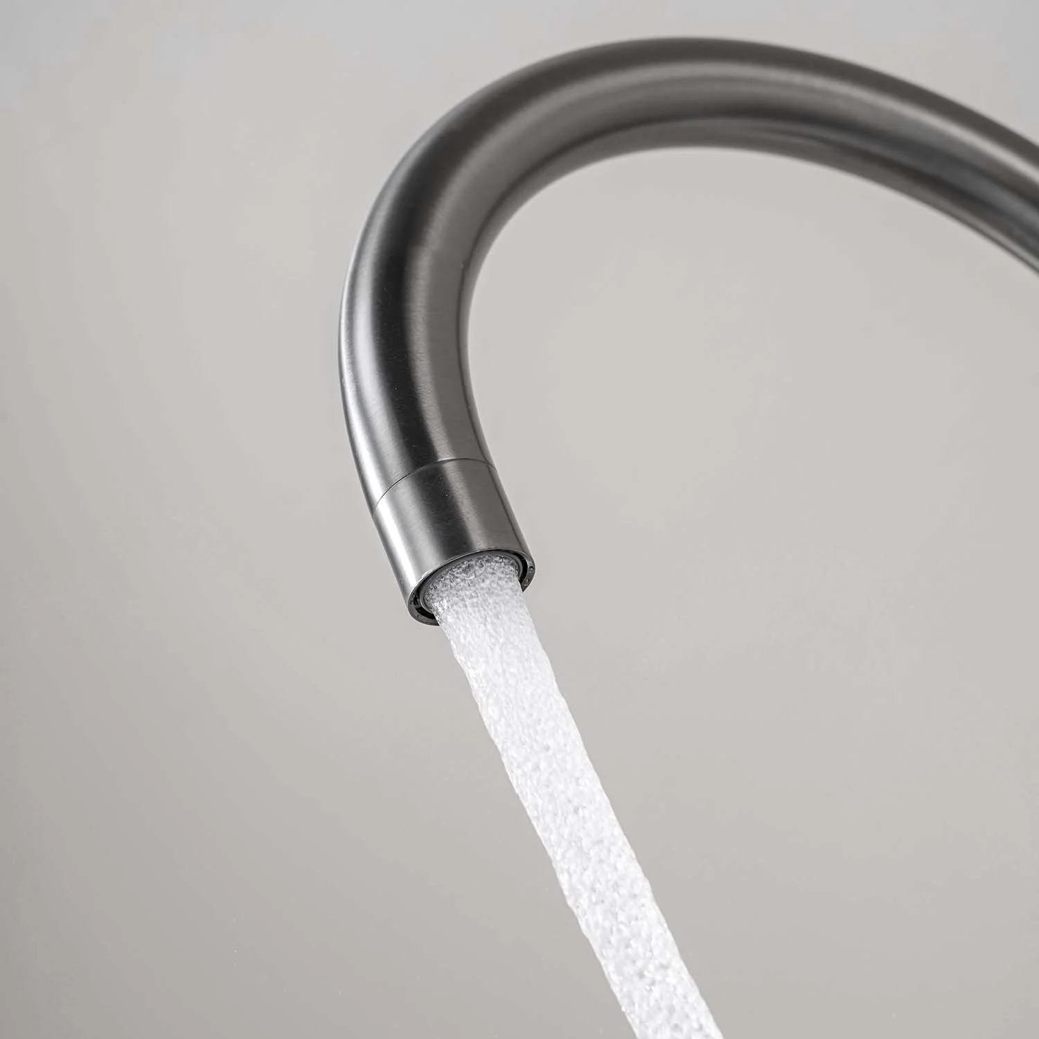 Jej stylowy kolor Grafit PVD sprawia, że idealnie komponuje się ze zlewami stalowymi utrzymanymi w podobnej tonacji, tworząc harmonijną i spójną aranżację kuchennej przestrzeni.