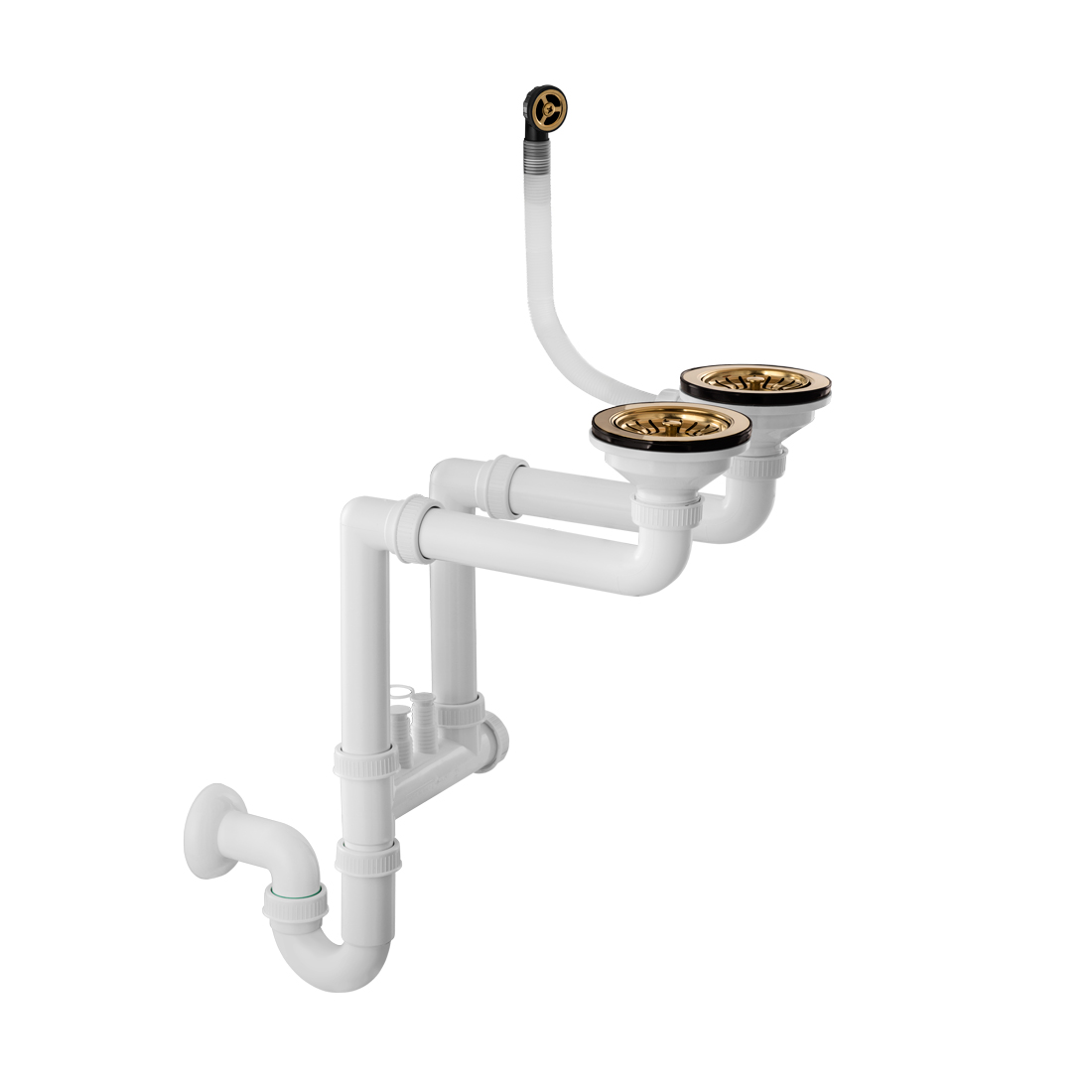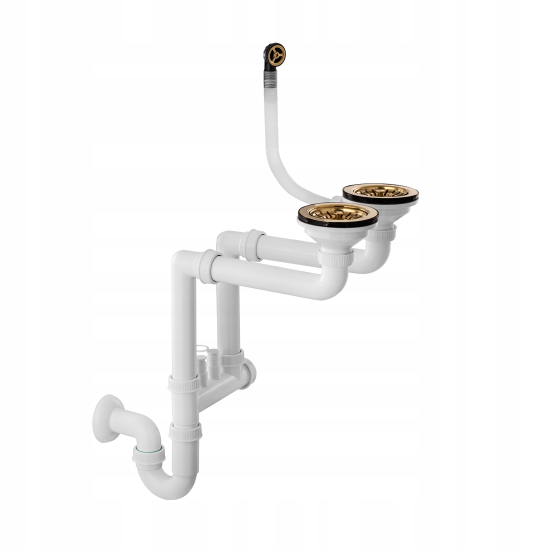 Syfon dwukomorowy w kolorze złotym, przeznaczony do zlewów dwukomorowych z okrągłym przelewem. Produkt charakteryzuje się: